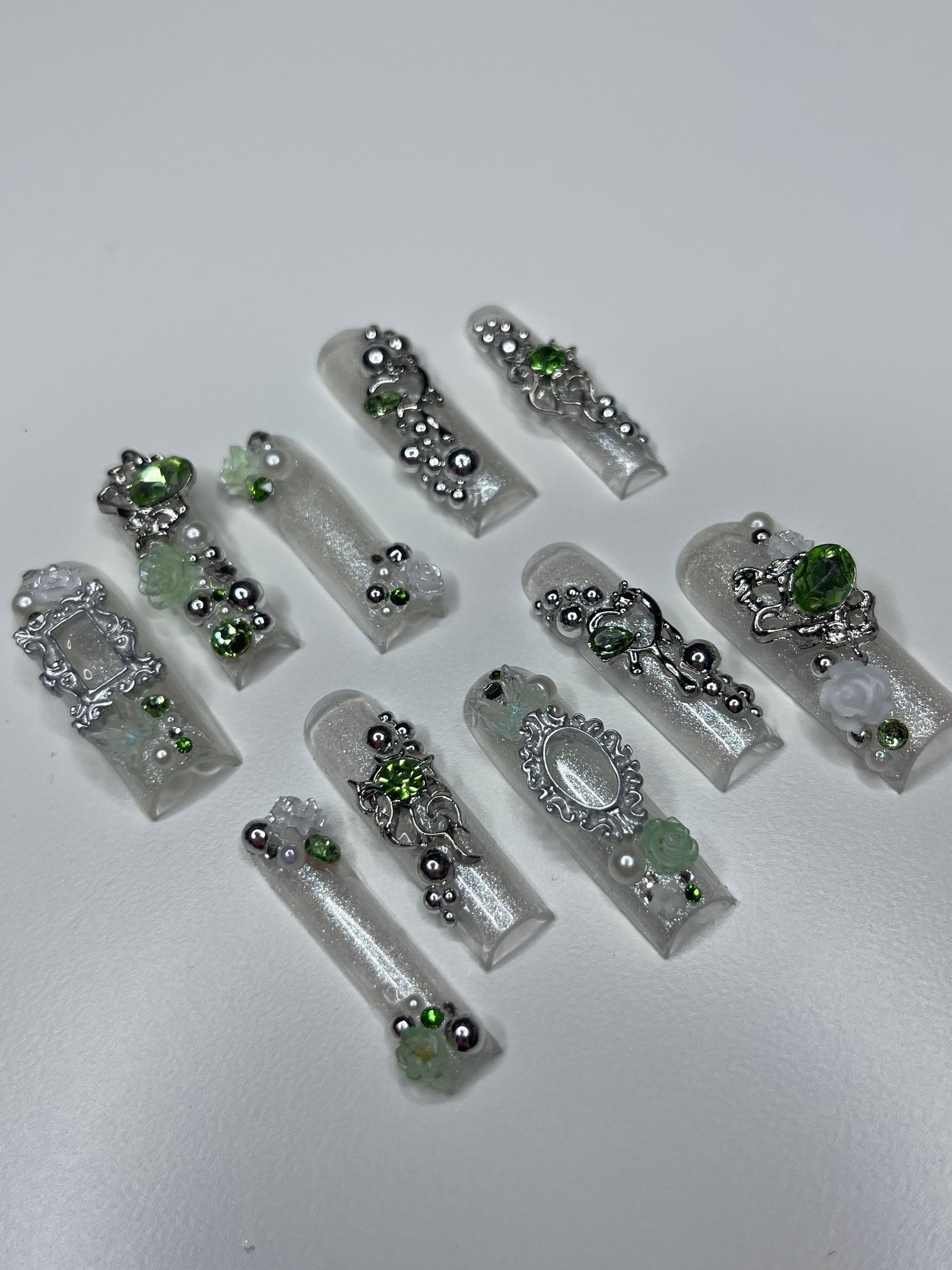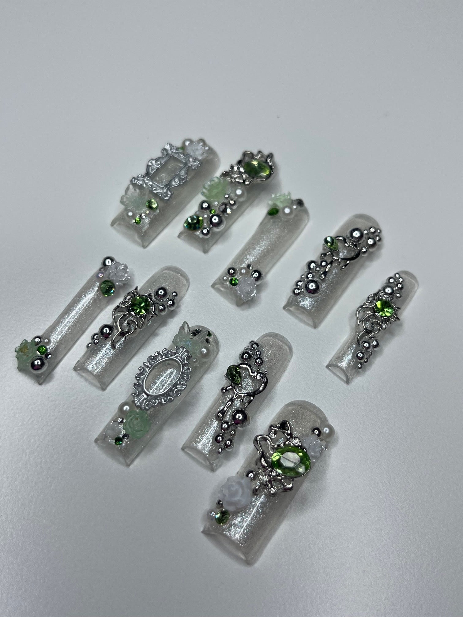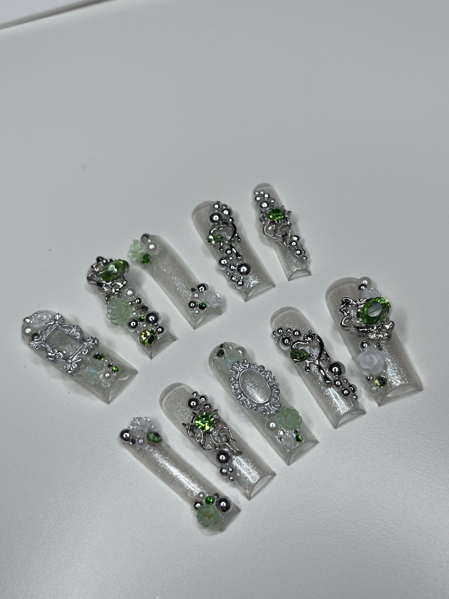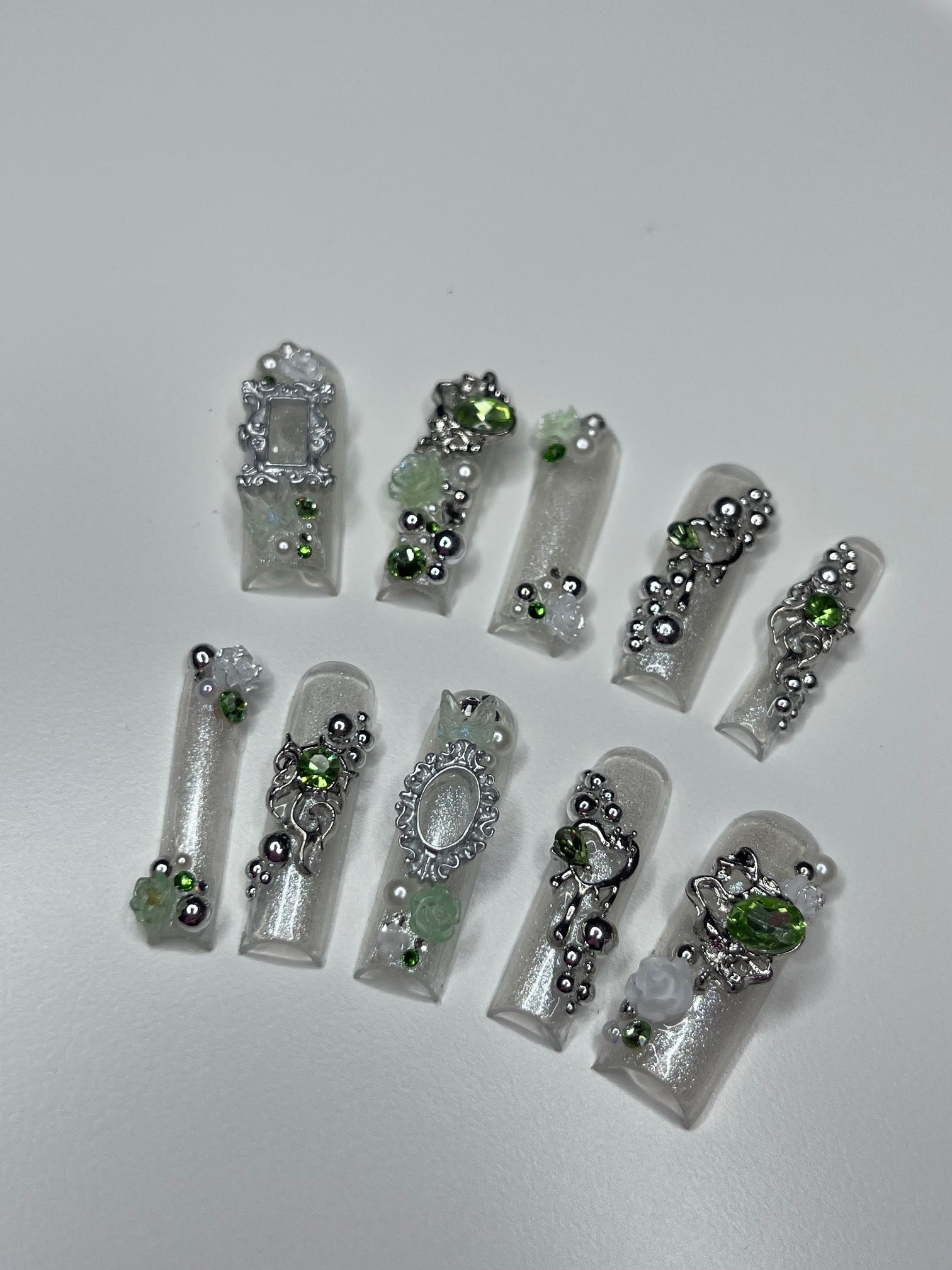 Introducing the "Green Fairy" series, a mesmerizing collection of custom press-on nails where elegance meets enchantment. Each set in this series is a unique handcrafted masterpiece, featuring a delicate palette of silver and light green shades, creating a serene yet sophisticated look. The nails are lavishly adorned with mirror spheres and sparkling jewels, adding a touch of whimsical glamour. Intricate details like tiny hearts and French frames, reminiscent of elegant mirror or picture frames, bring an artistic and luxurious feel to each nail. The Green Fairy series is not just a set of nails; it's wearable art, promising to add a magical touch to your every gesture.
