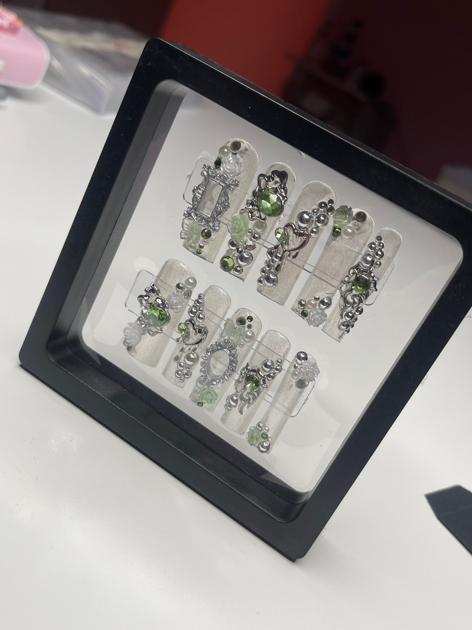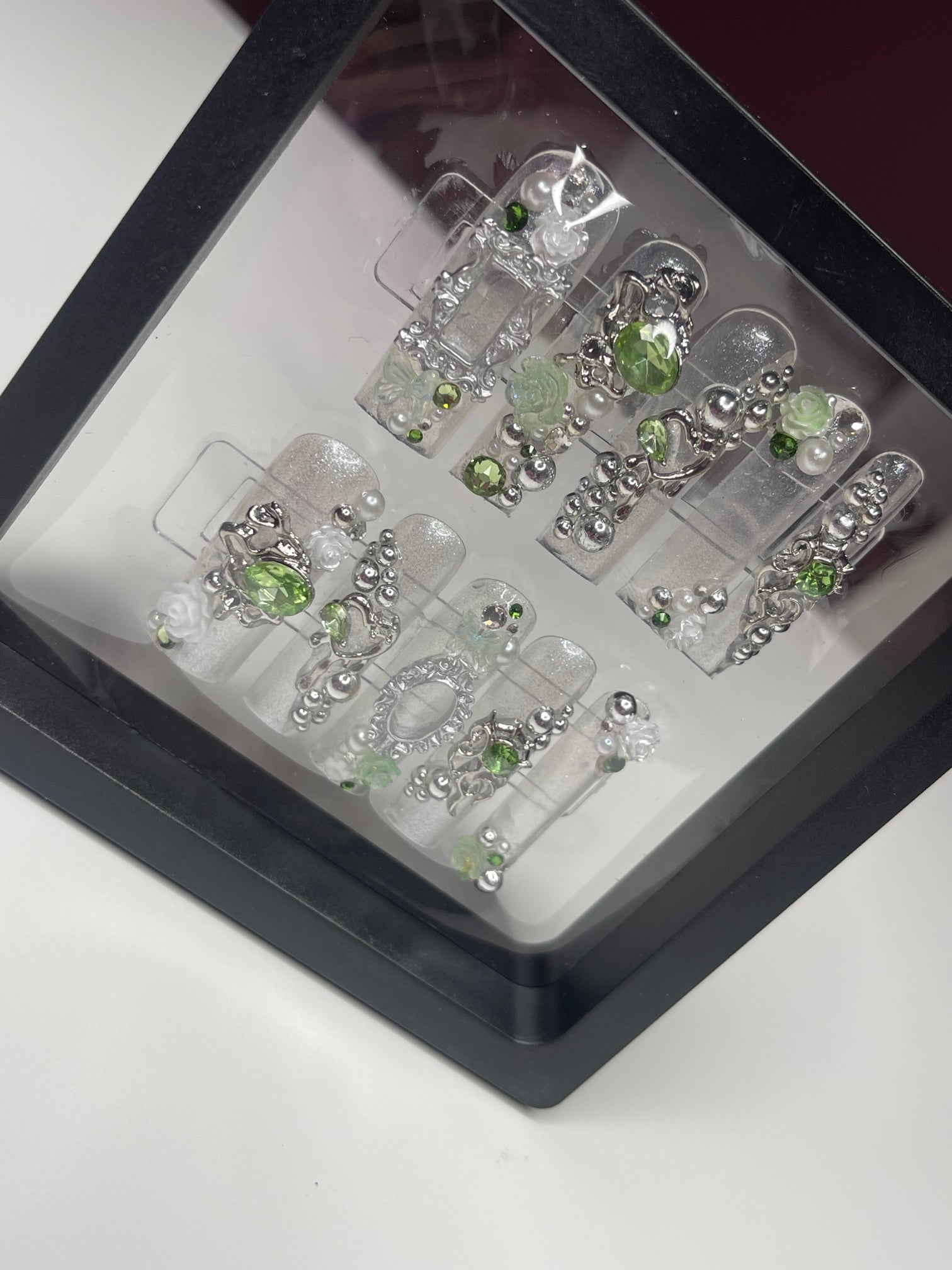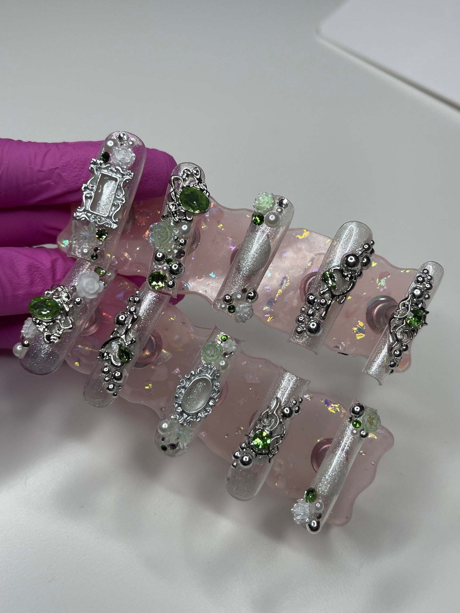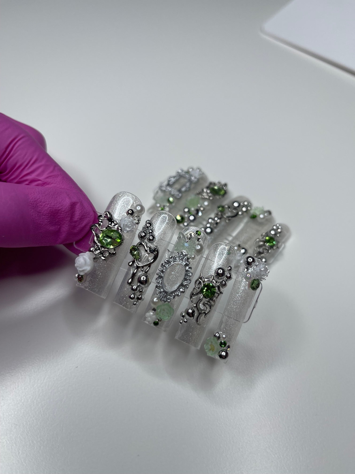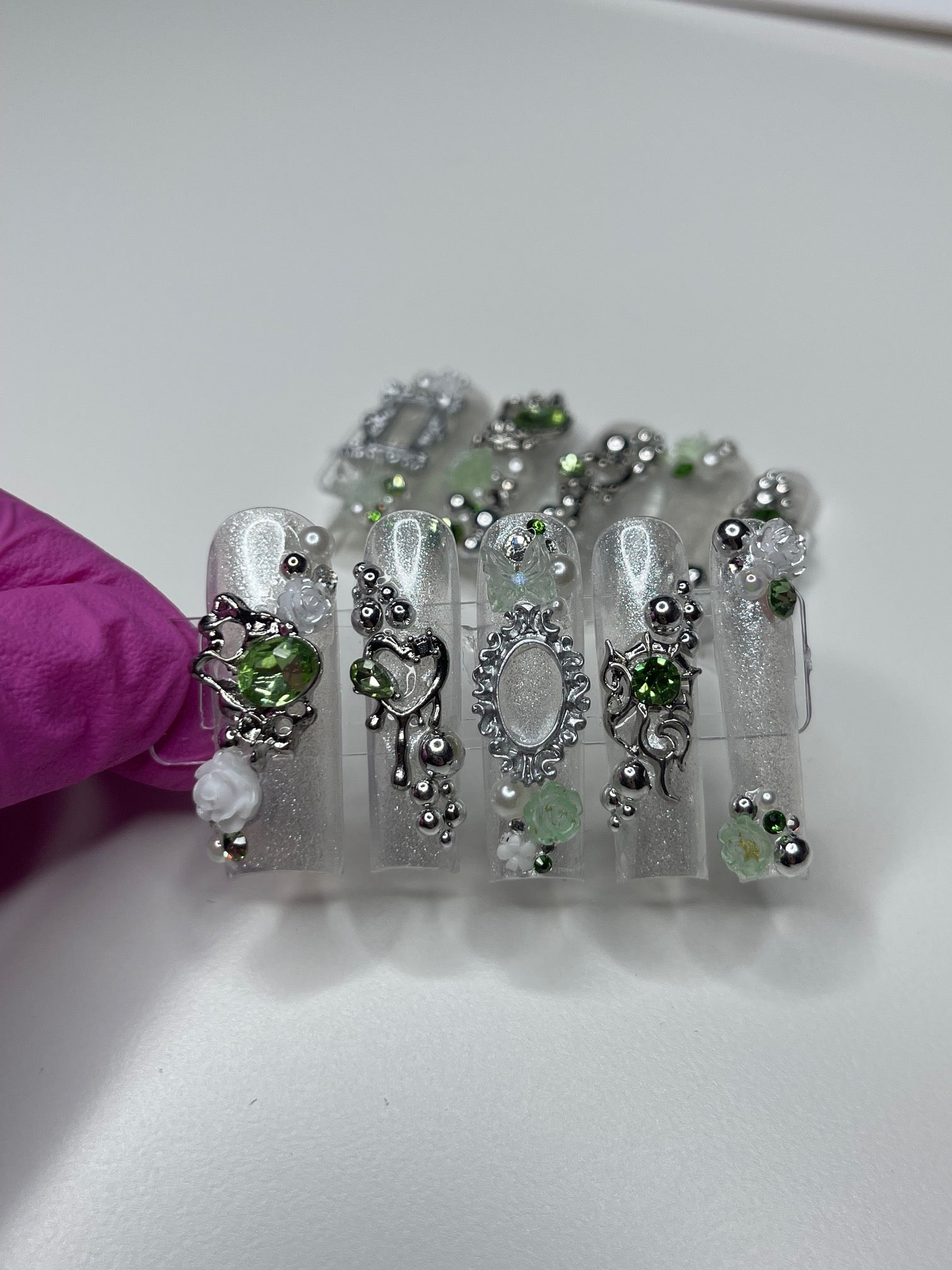 Introducing the "Green Fairy" series, a mesmerizing collection of custom press-on nails where elegance meets enchantment. Each set in this series is a unique handcrafted masterpiece, featuring a delicate palette of silver and light green shades, creating a serene yet sophisticated look. The nails are lavishly adorned with mirror spheres and sparkling jewels, adding a touch of whimsical glamour. Intricate details like tiny hearts and French frames, reminiscent of elegant mirror or picture frames, bring an artistic and luxurious feel to each nail. The Green Fairy series is not just a set of nails; it's wearable art, promising to add a magical touch to your every gesture.